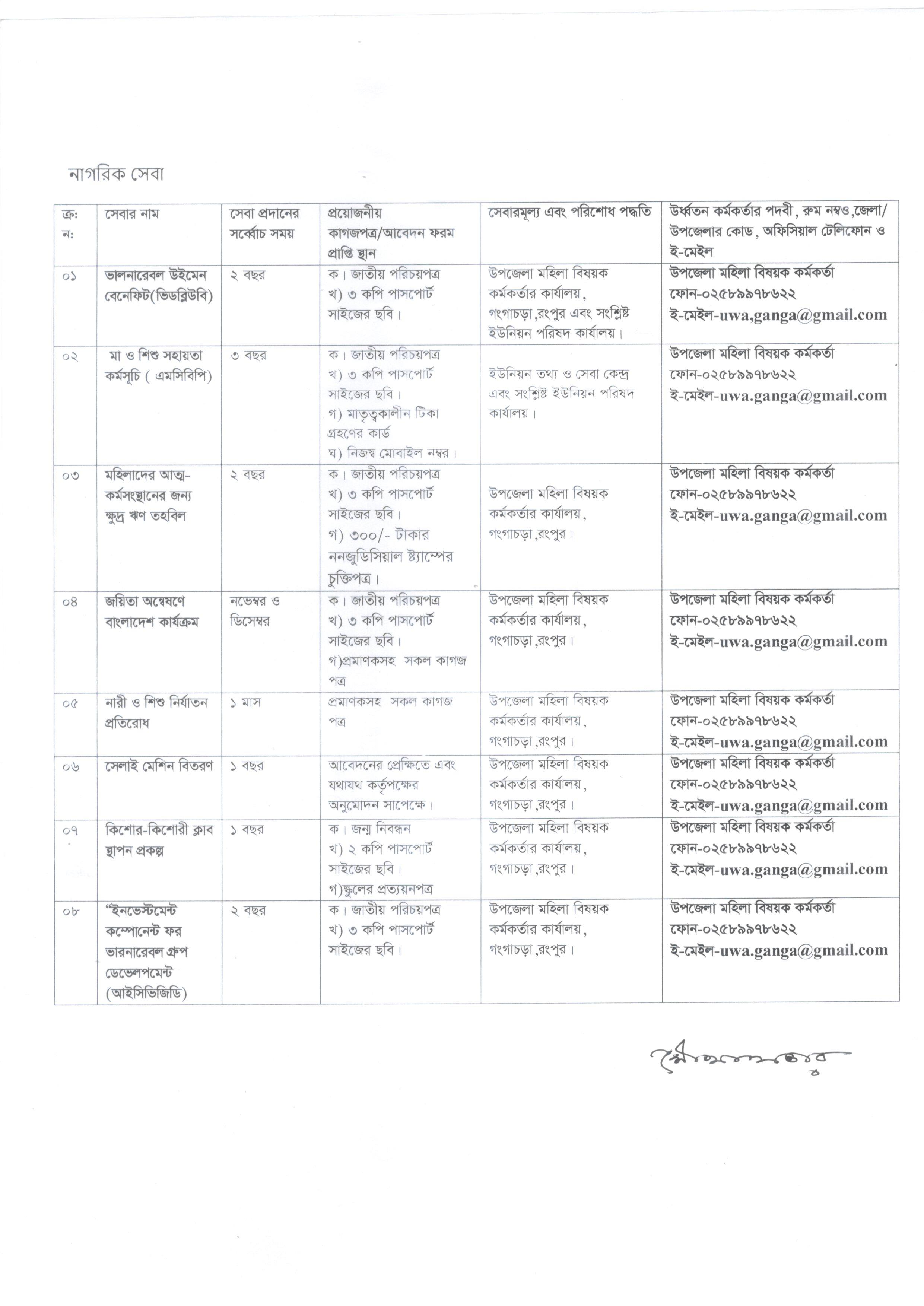 | উপজেলা মহিলা বিষয়ক কর্মকর্তা কার্যালয়, গংগাচড়া,রংপুর | বিনামূল্যে সেবা প্রদান। | উপজেলা মহিলা বিষয়ক কর্মকর্তা